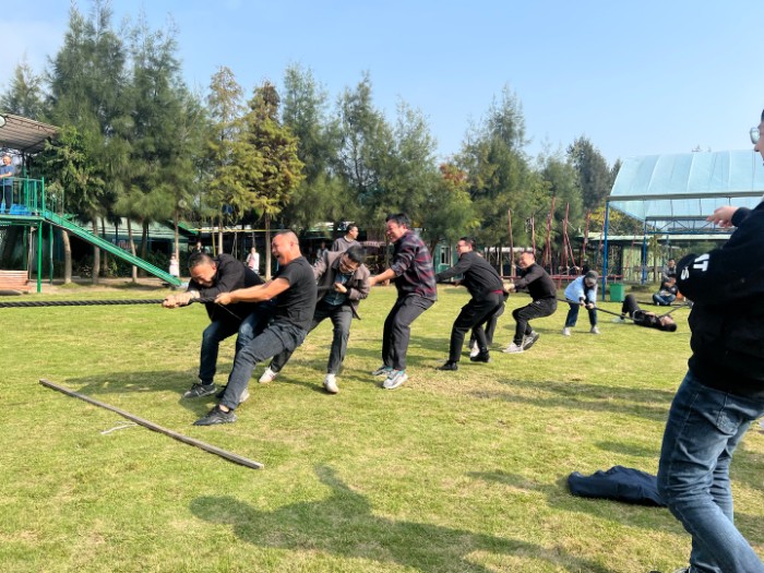 天翁作美,一大早陽光滿溢,在一聲聲加油吶喊中我們開始了本次團建活動的第一個項目,選手們緊緊地抓住繩子,個個弓著腿,身子向后倒,有節(jié)奏地喊著:拉!拉!拉!